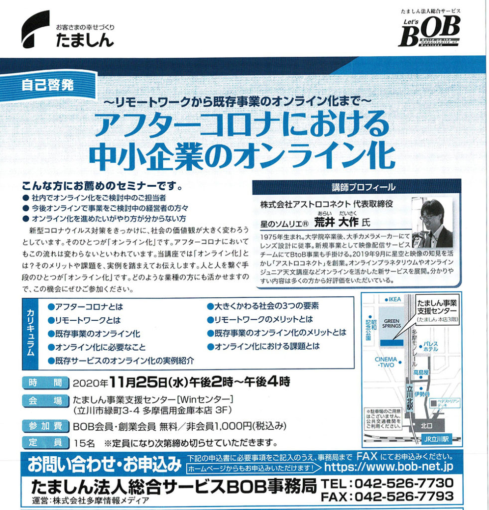 アストロコネクト代表取締役の荒井が、11月25日に、多摩信用金庫様主催のセミナーにて「アフターコロナにおける中小企業のオンライン化」と題して登壇することになりました。