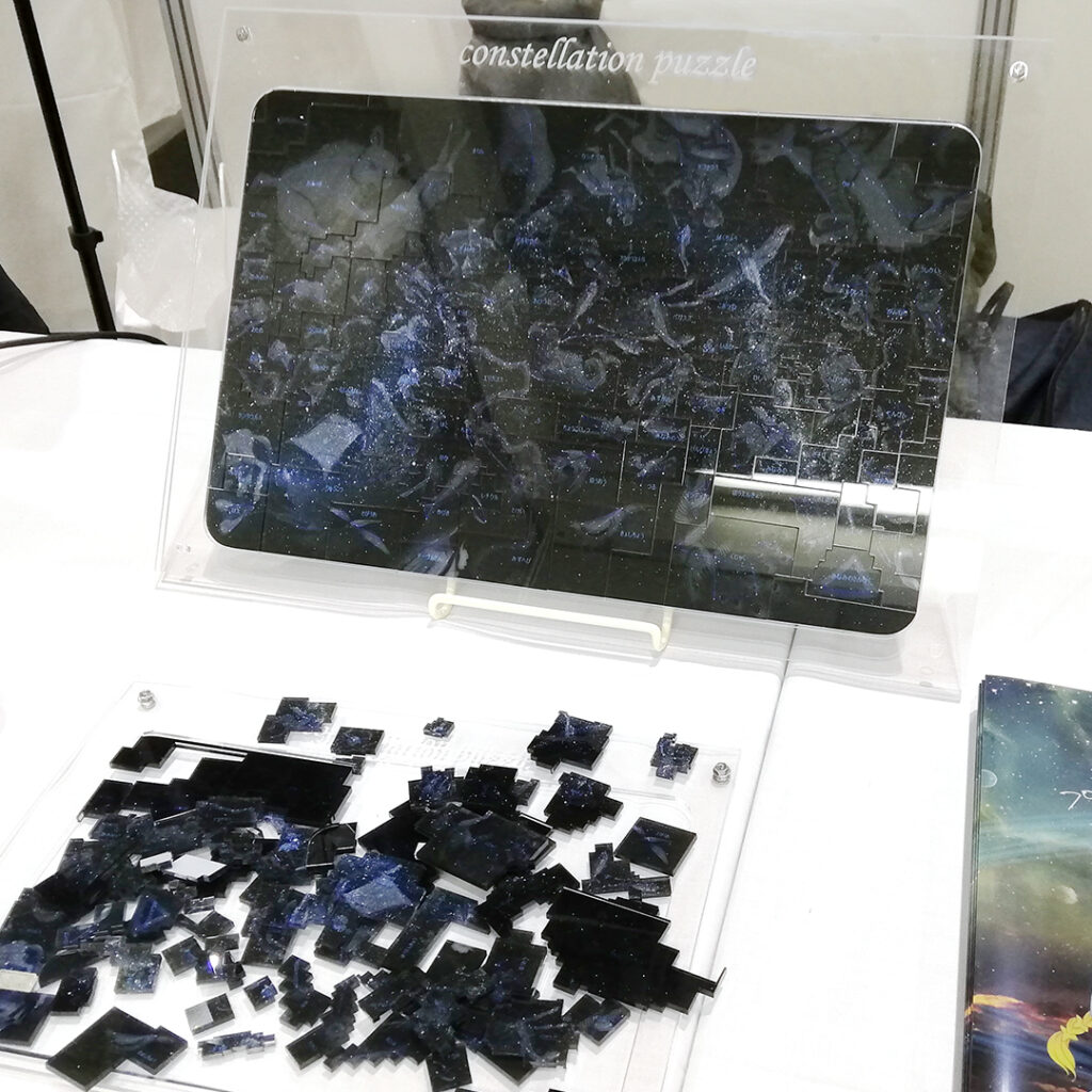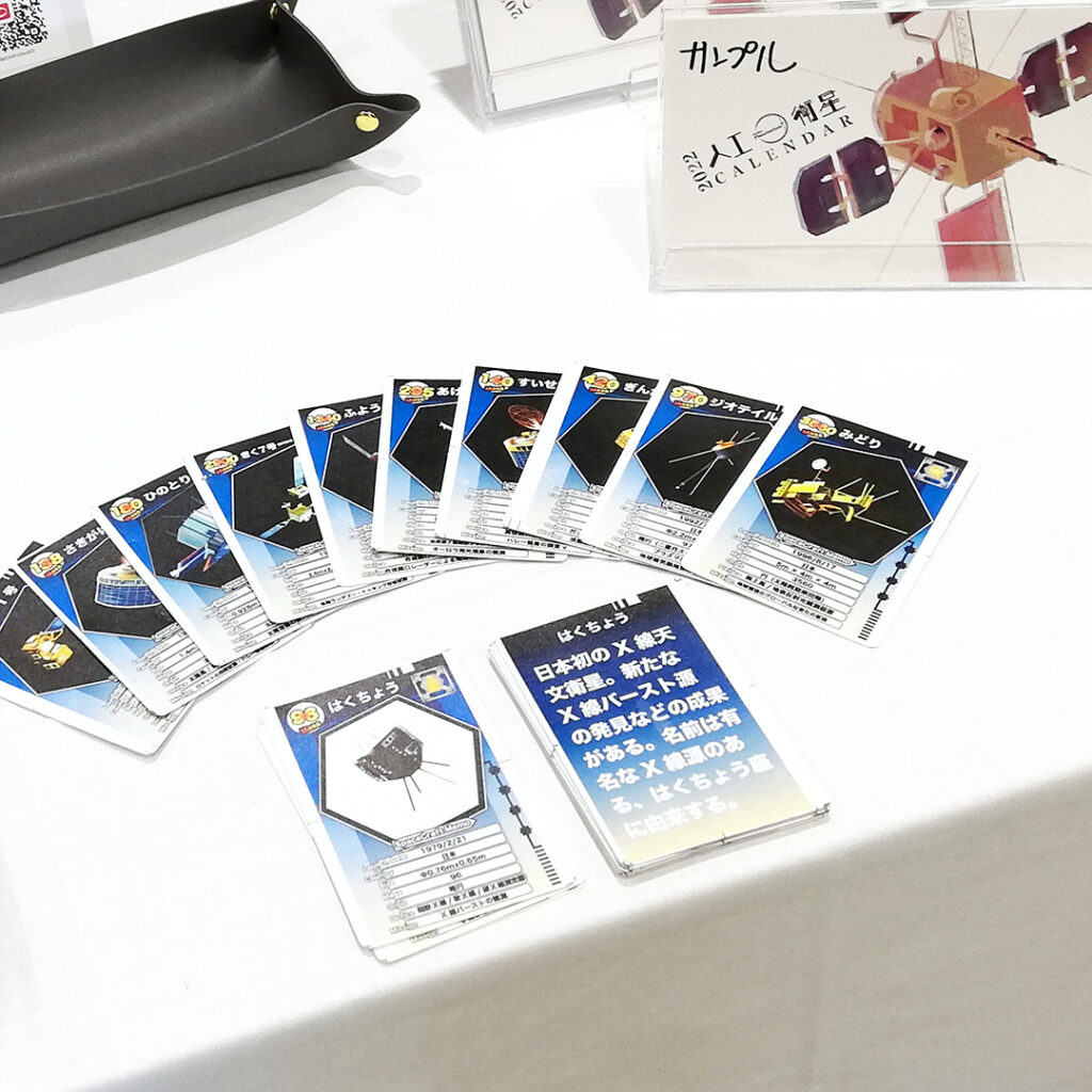 ブースでは、オンラインプラネタリウムの紹介、現在試作中の「人工衛星百人一首(仮)」と「星座境界線パズル」また、当展示会初発表・初販売の「人工衛星カレンダー2022」などを展示いたしました。
