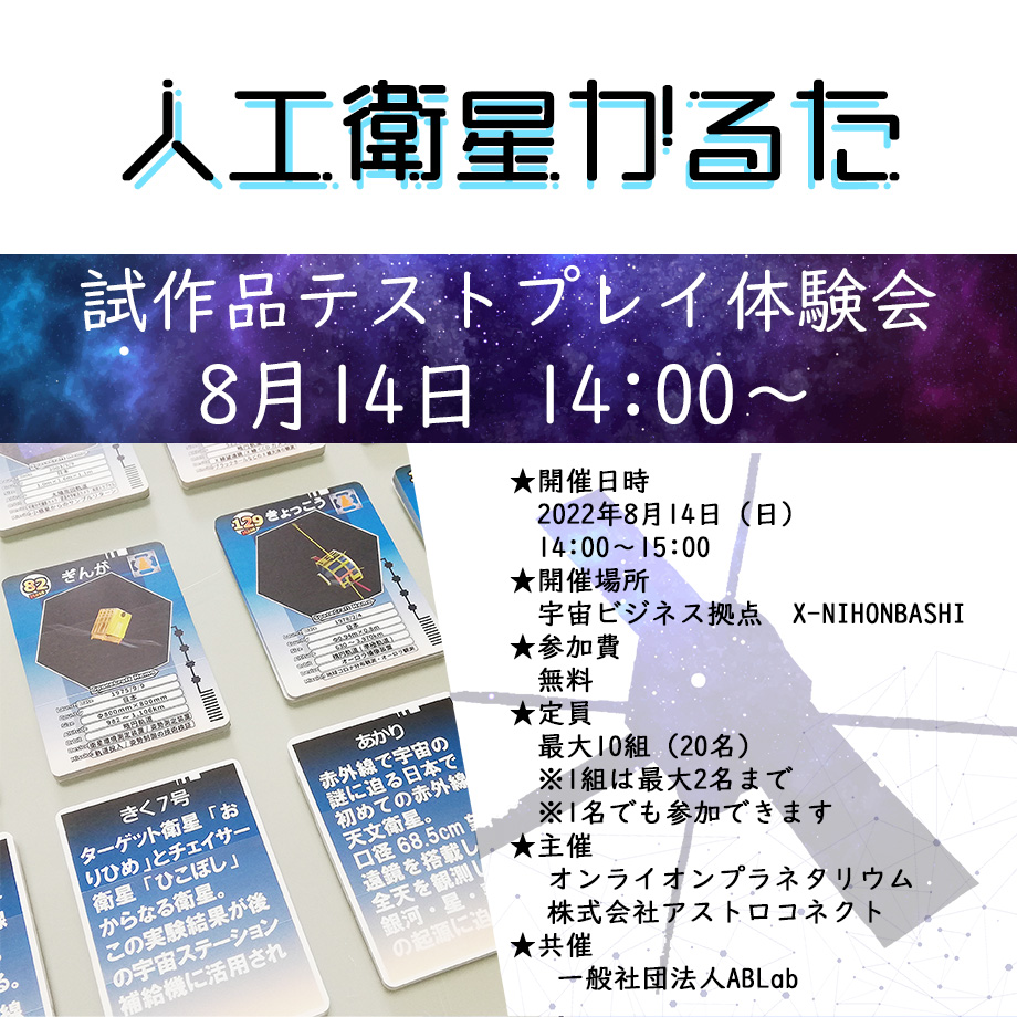 アストロコネクトが運営を行っている「オンラインプラネタリウム」で現在制作している「人工衛星かるた」の試作品テストプレイ体験会を8月14日(日)に開催いたします。