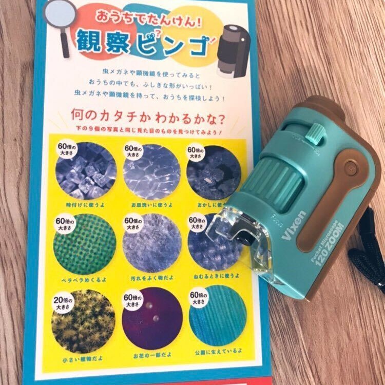塩、砂糖、ティッシュ…。身近な物は顕微鏡で見るとどう見えるだろう?オリジナルのビンゴカードを使って、正解を探し出しながら様々な物を観察します。カードの裏面には家で観察スケッチができるワーク付き。ビンゴを目指しましょう。