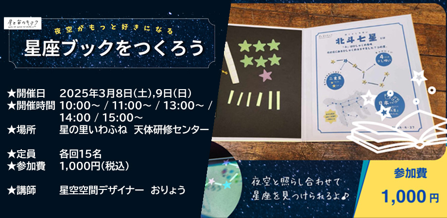 星空空間デザイナー「おりょうさん」企画のオリジナル星座本の製作ワークショップです。夜空で輝く仕組みになっているので、マイ星座本を片手に星空の中にある星座を探してみませんか?