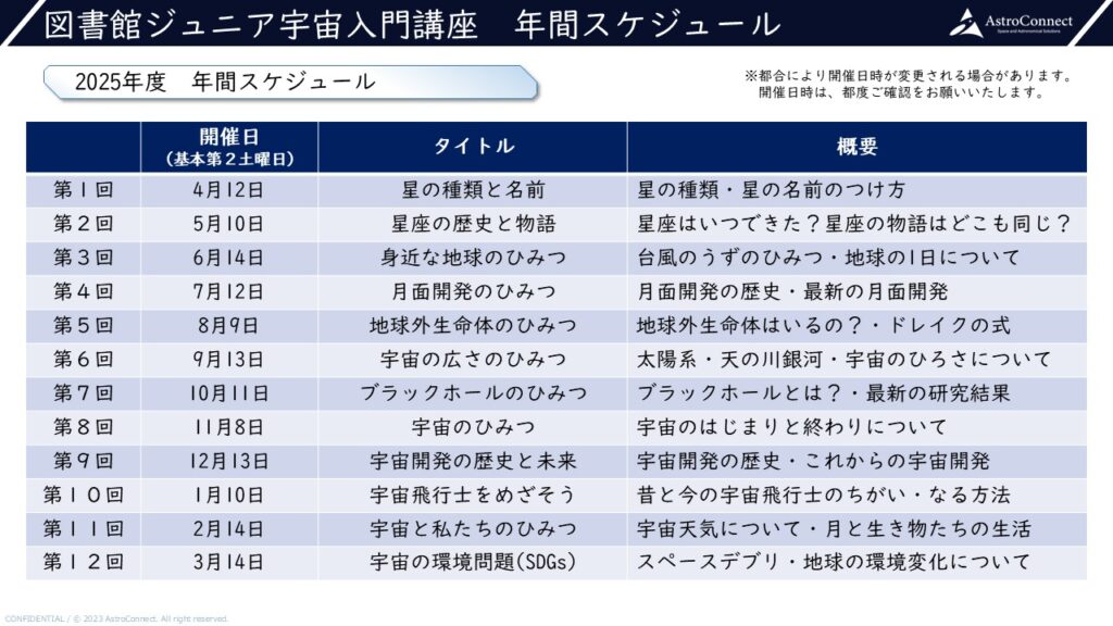 2024年からスタートした海老名市立中央図書館『図書館ジュニア宇宙入門講座』ですが、2025年度も開催することが決定いたしました。2025年4月12日(土)に2025年度第1回を開催いたします。