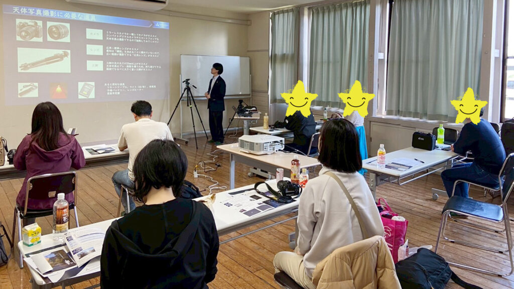 会場は栃木県塩谷町にある「星ふる学校 くまの木」です。関東一帯の「光害」の端に位置する場所にあり、夜になると綺麗な星空が見える場所です。また、元学校ということもあり元「教室」でカメラの使い方を習うことができたり、とても理想的な環境をお借りして実施いたしました。