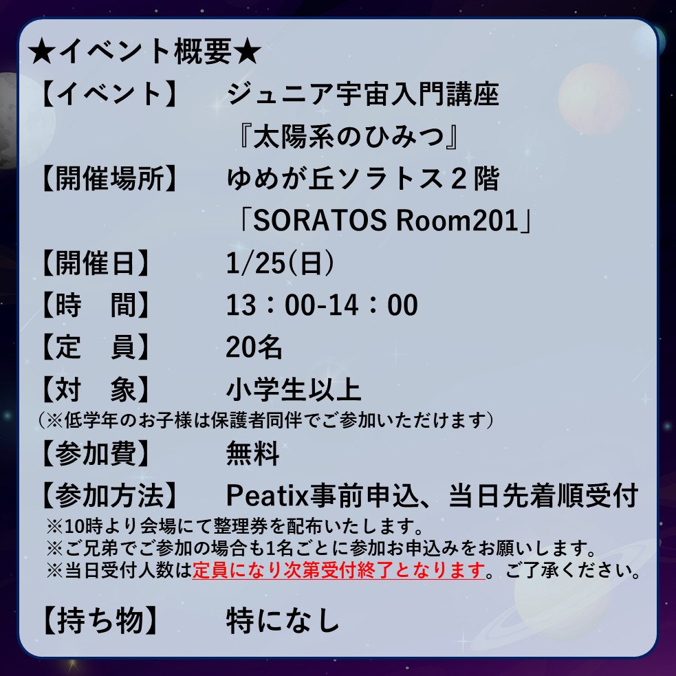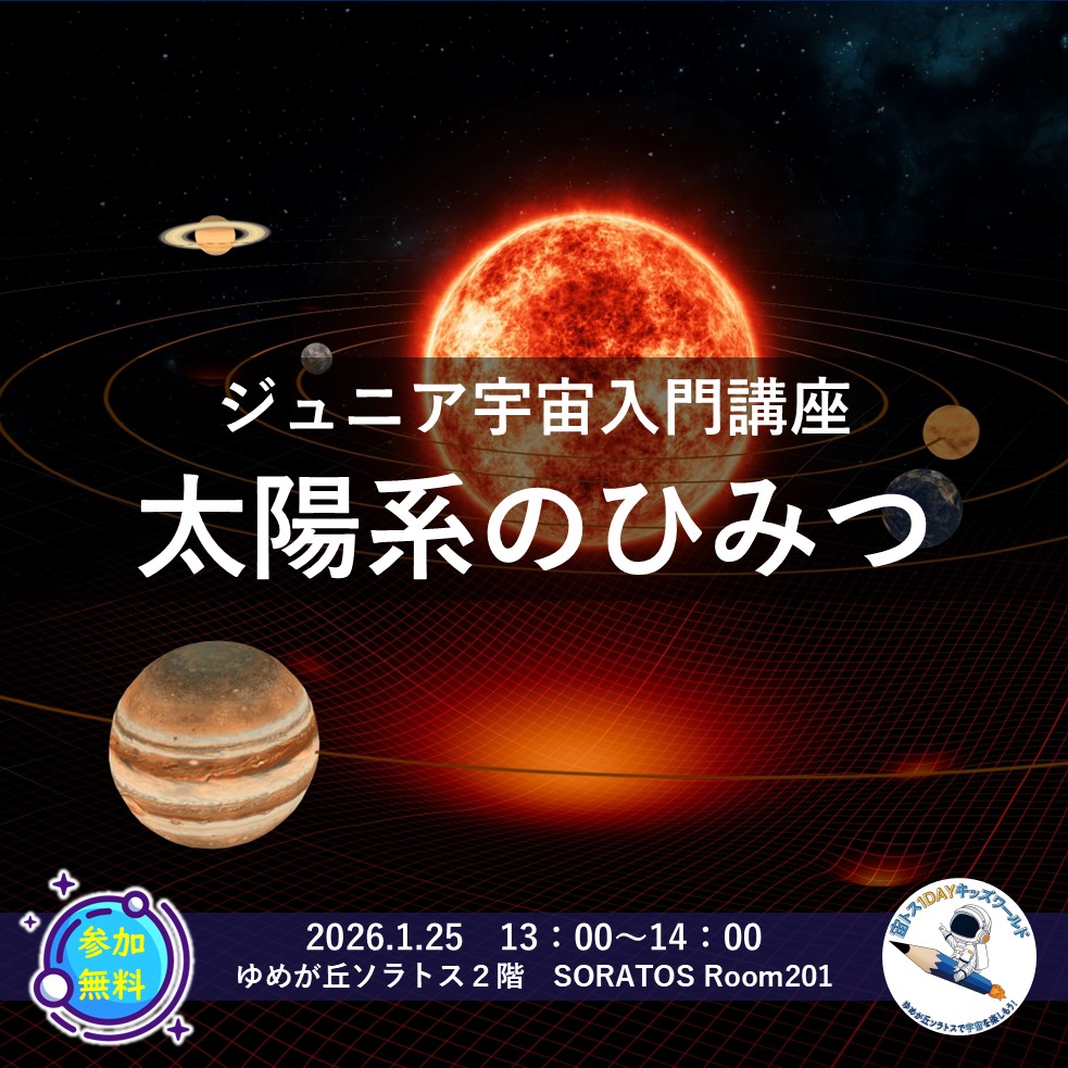 相鉄いずみ野線ゆめが丘駅直結大型商業施設「ゆめが丘ソラトス」にて、『宙トス1DAYキッズワールド』と題して、宇宙を楽しむワークショップ、ジュニア宇宙入門講座を、1月25日(日)に開催いたします。