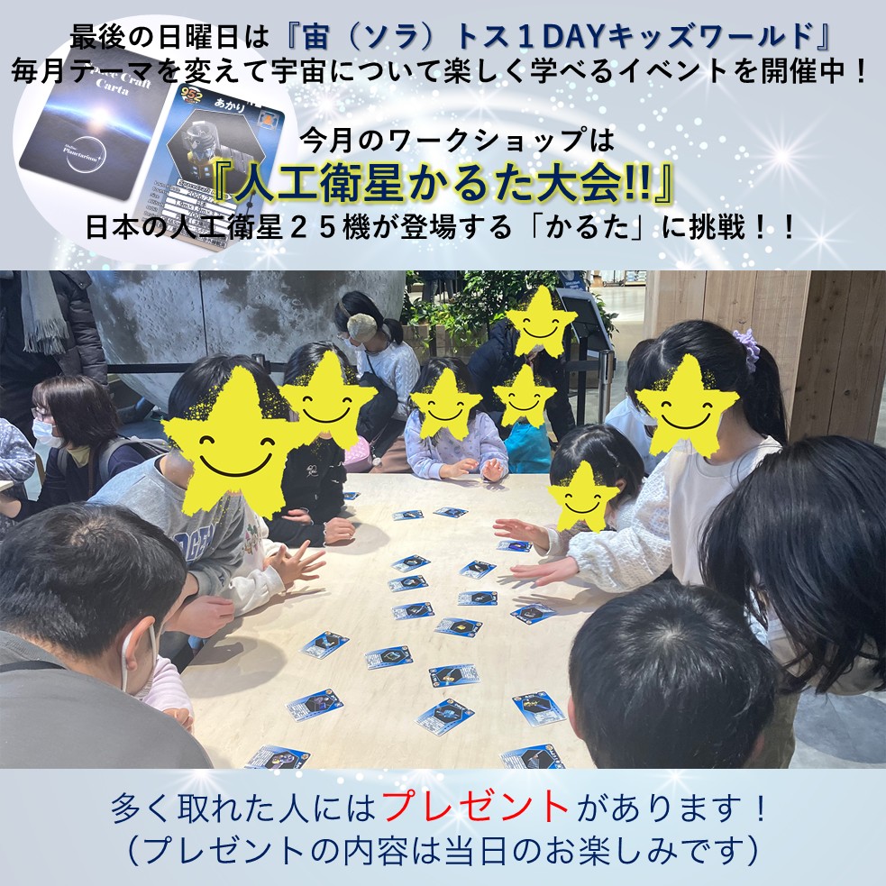 「ゆめが丘ソラトス」では、毎月最後の日曜日に、毎月テーマを変えて宇宙について楽しく学べる1日イベント『宙トス1DAYキッズワールド』を開催中。