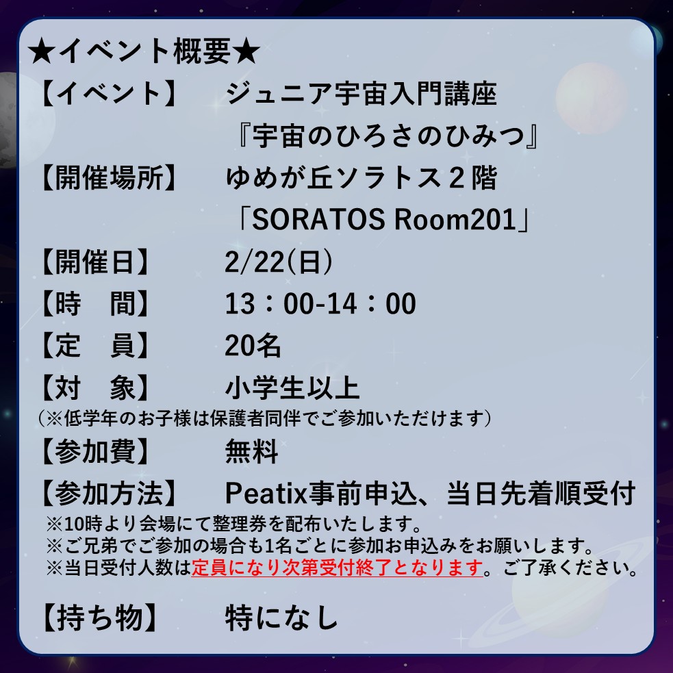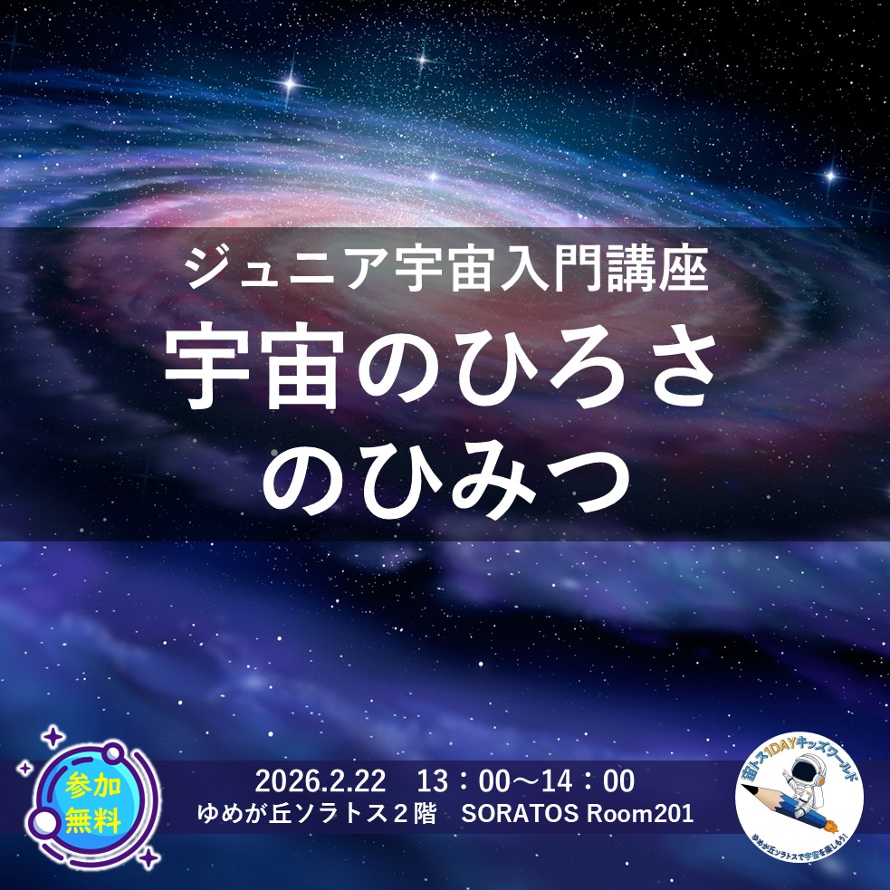 相鉄いずみ野線ゆめが丘駅直結大型商業施設「ゆめが丘ソラトス」にて、『宙トス1DAYキッズワールド』と題して、宇宙を楽しむワークショップ、ジュニア宇宙入門講座を、2月22日(日)に開催いたします。