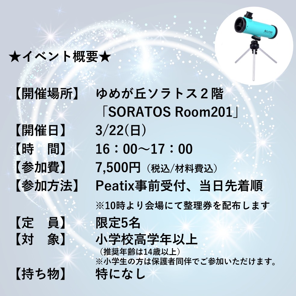 相鉄いずみ野線ゆめが丘駅直結大型商業施設「ゆめが丘ソラトス」にて、『宙トス1DAYキッズワールド』と題して、宇宙を楽しむワークショップ、ジュニア宇宙入門講座を、3月22日(日)に開催いたします。