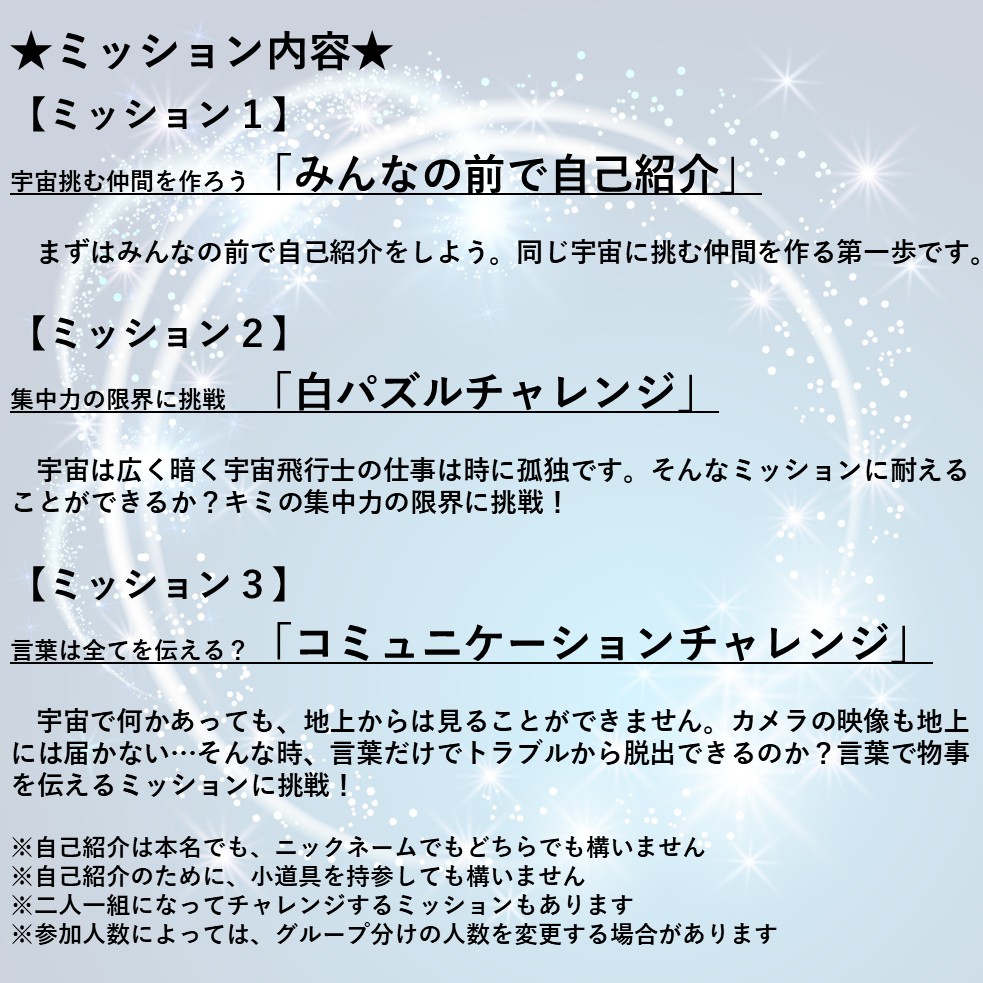 今回はとても厳しいといわれる『宇宙飛行士選抜試験』に登場したことがあるテストを実際に体験することで、宇宙飛行士に求められる資質や宇宙飛行士のことを知ることができるワークショップです。