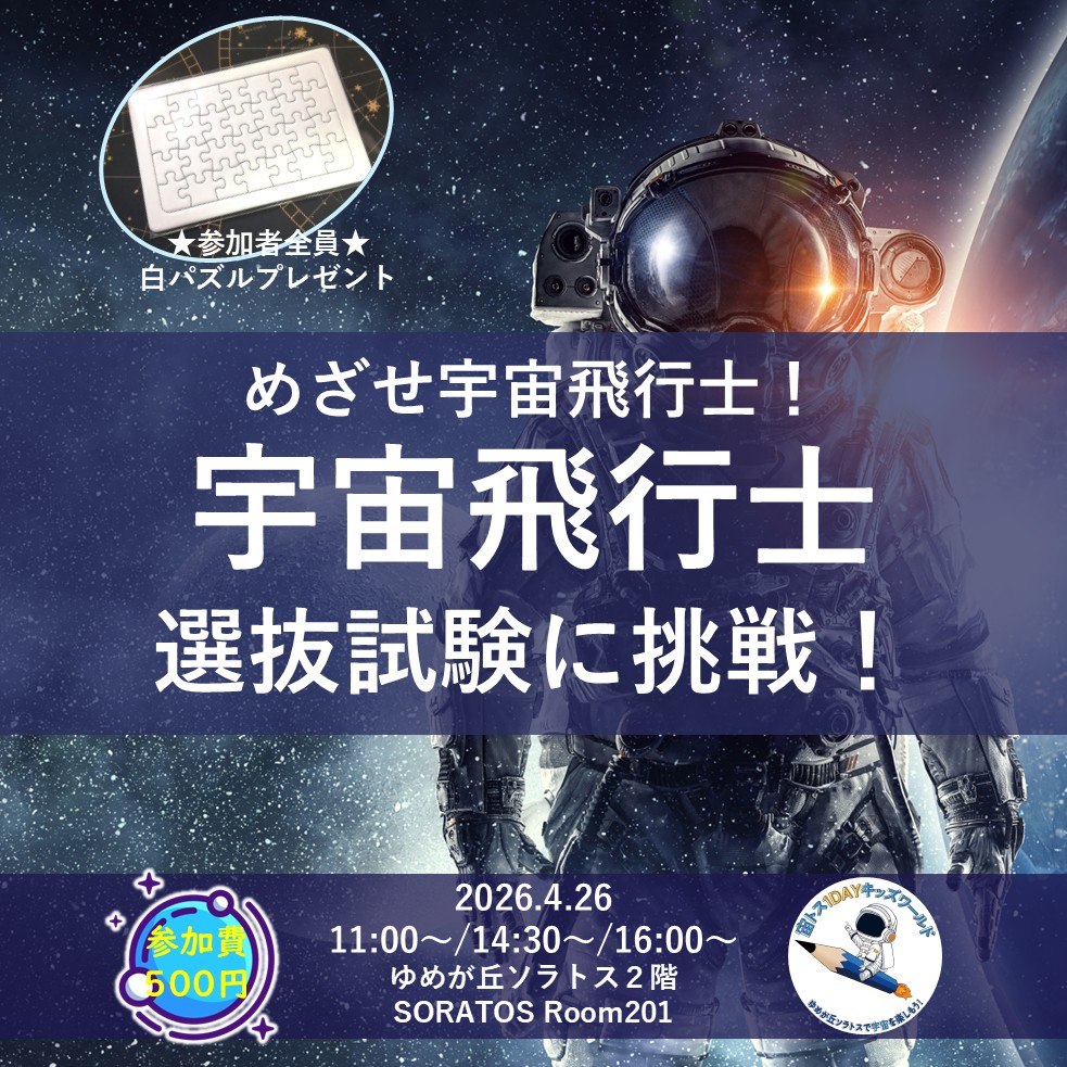 相鉄いずみ野線ゆめが丘駅直結大型商業施設「ゆめが丘ソラトス」にて、『宙トス1DAYキッズワールド』と題して、宇宙を楽しむワークショップ、ジュニア宇宙入門講座を、4月26日(日)に開催いたします。