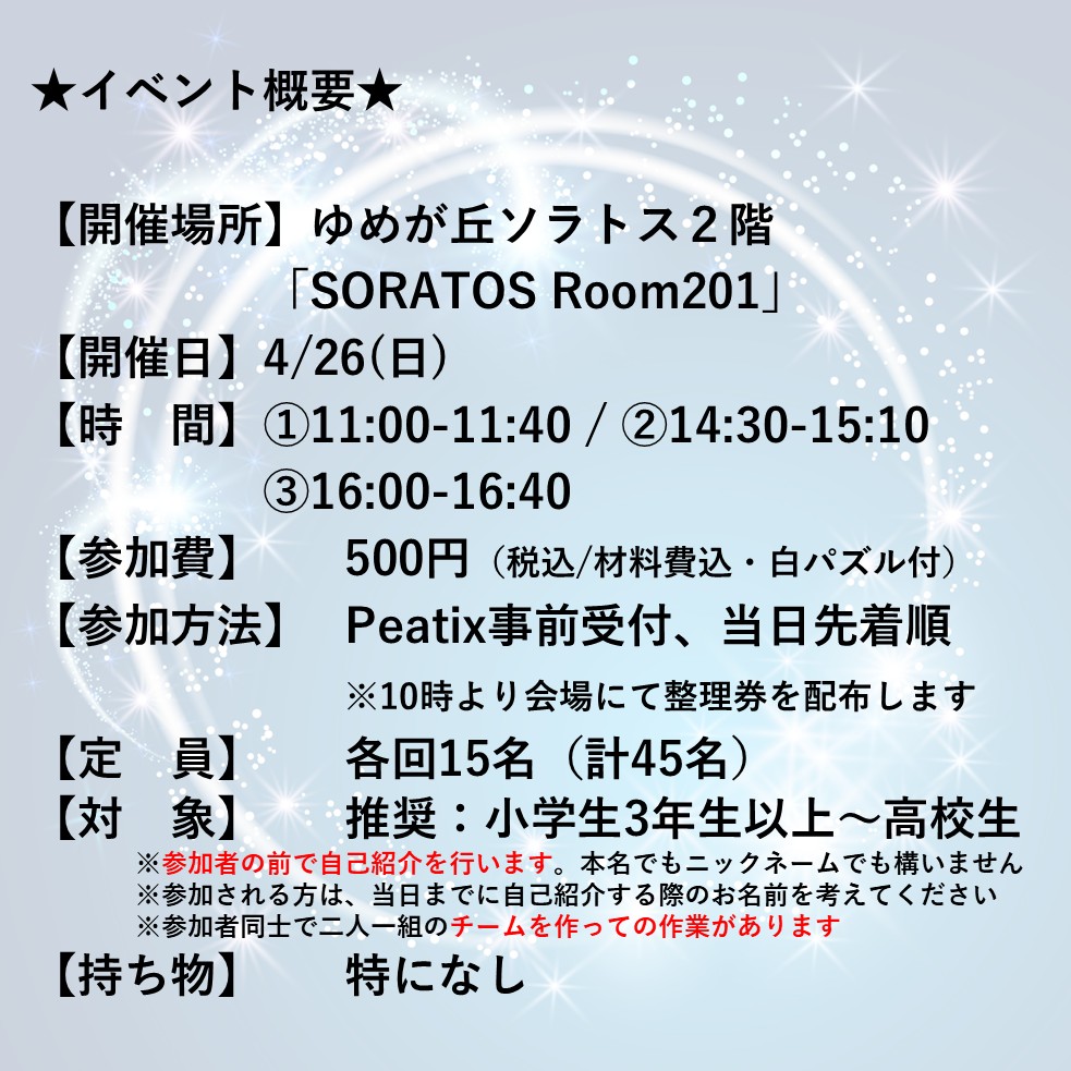 【参 加 費】500円(税込/材料費込・白パズルはお持ち帰り頂きます)